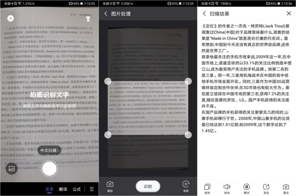 使用讯飞输入法的拍照输入,我们随便翻开书的一页,选取其中一部分进行扫描录入,文字和标点很快就被讯飞输入法准确识别并加以分段排版。