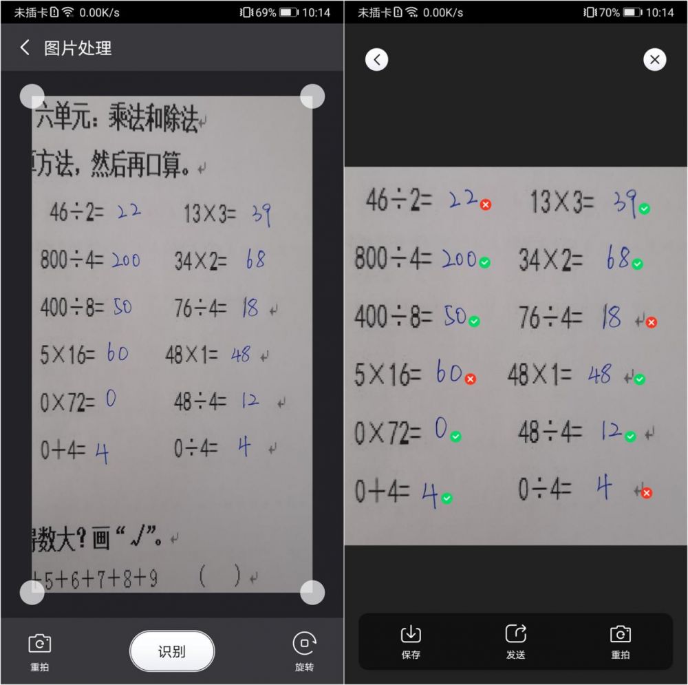 与此同时,对于一些小学算术题,讯飞拍照输入支持智能批改,在老师和家长无暇批改作业时,用于辅助教学是完全没问题的。