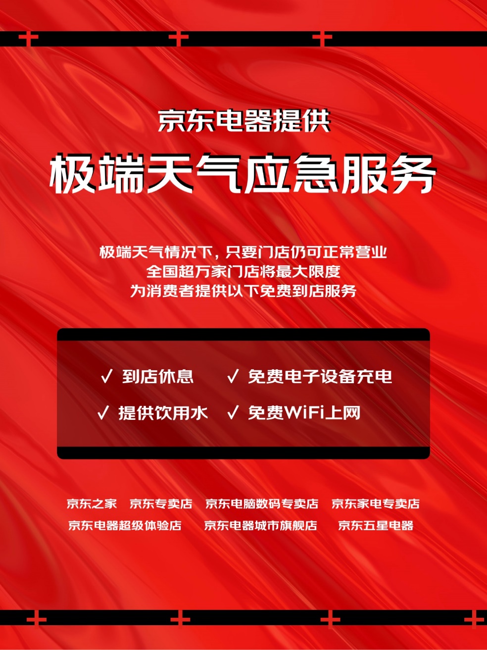 京东电器第一时间推出了极端天气应急服务,联动当地仍可正常营业的京东之家、京东专卖店、京东电脑数码专卖店等线下门店,为市民提供汛情避险场所和应急服务。未来在遇到极端天气的情况下,京东电器在全国的线下门店,包括京东之家、京东专卖店、京东电脑数码专卖店、京东家电专卖店、京东电器超级体验店、京东电器城市旗舰店、京东五星电器等门店只要仍可正常营业,将最大限度为附近的消费者提供到店休息、饮用水、电子设备充电、WiFi上网等免费应急服务。
