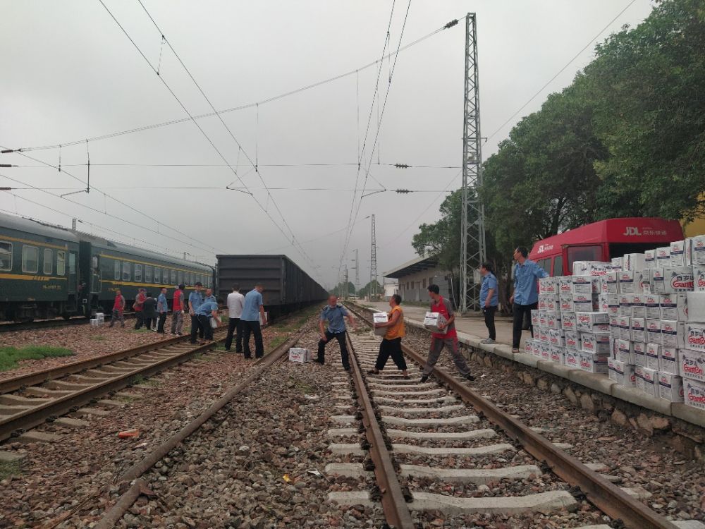 在第二批物资车队驶出仓库的同时,第三批满载540多箱食品和矿泉水的京东物流车涉水抵达K226/7次列车临时停靠的郑州铁炉站,为仍在滞留的数百名旅客送去应急物资。
