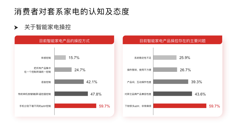 《白发书》经过对近1800名消费者和家居设计师等市场调研,当前套系家电需要解决的问题是智能终端控制的开放性及兼容性,过于封闭会导致消费者在使用过程中的不良体验,甚至对整体智能化设计产生抵触情绪。调研过程中,近六成的被访者对智能终端操控更需要“下载很多APP,非常麻烦”表示不满。