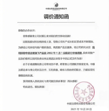 近日,中顺洁柔发布调价通知函:近期因原材料价格持续上涨,导致公司生产成木和运营成本不断增加,为保证公司持续向客户提供稳定、高质量产品及服务,经公司研究决定:公司拟将中顺洁柔旗下产品自2022年1月1日起进行价格调整,具体调整产品及价格将以公司负责业务近期送达的正式文件为准。