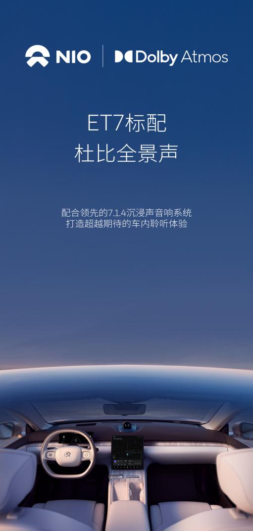 驱动中国2021年11月16日消息,今日,蔚来宣布与杜比达成合作,智能电动旗舰轿车蔚来ET7将标配杜比全景声(Dolby Atmos),通过7.1.4沉浸声音响系统,为用户带来车内聆听体验。