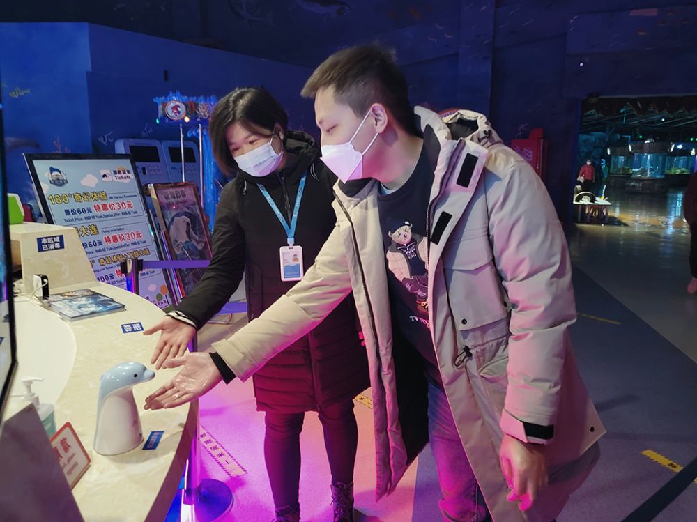 京东旅行联手京东健康、稳健医疗,在七个海昌海洋公园放置海豚造型自动消毒洗手机