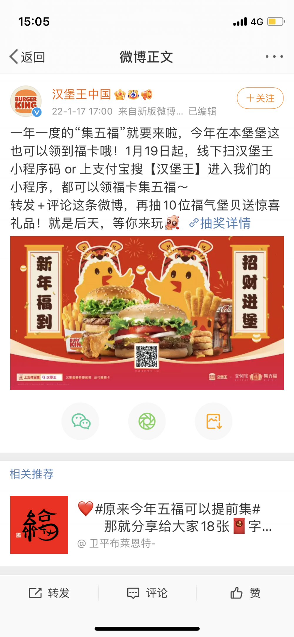 五福到,好运来。年末为了给用户讨个好彩头,今年汉堡王也加入了五福的发福卡队列。