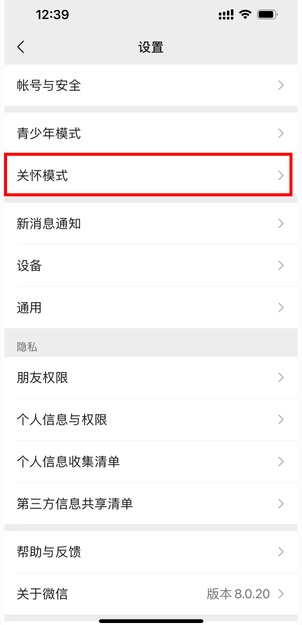 进入设置界面后,点击菜单栏中的关怀模式