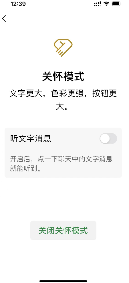 3.增加了一个非常方便的文字朗读功能,在开启关怀模式的时候会有一个是否开启“听文字消息”的开关,将其开启后,用户只需要点击聊天对话框里的某条文字消息,微信就会将其朗读出来,收到新消息再也不用忙着到处找眼镜啦了。