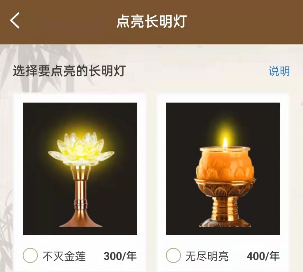 同样无创建审核流程,且界面过于简陋。在选择祭奠贡品时,以长明灯为例,最低300元/年。时效期过后,需再次充值。