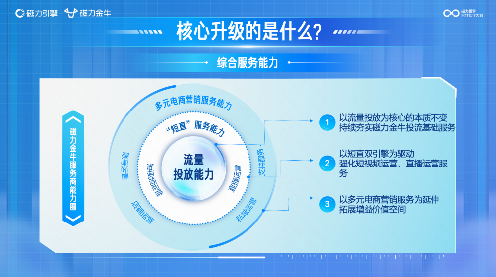 据快手磁力金牛运营负责人阿稳介绍,此次升级的核心内容是打造综合性电商营销服务能力圈。具体来看,该能力圈包含三个层级:要求磁力金牛服务商以流量投放能力为核心,持续夯实磁力金牛投流基础服务;以短视频+直播双引擎为驱动,强化两者的运营服务能力;以账号运营、店铺运营、私域运营等多元电商营销服务为延伸,在为电商广告主提供综合性、高质量营销服务的同时,也能拓展自身增益价值空间。