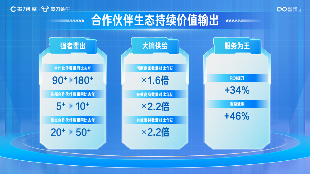 磁力金牛自去年5月上线以来,累计服务客户已突破几十万、涨粉效率提升46%、营销ROI提升34%,所覆盖的活跃商家数量、有效商品数量、有效素材数量均有明显突破。在服务商层面,磁力金牛渠道合作伙伴数量已经超过180家,头部和腰部合作伙伴加速成长。快手磁力金牛渠道销售负责人王芳表示:“随着快手商业形态的发展,电商商家的成长诉求更多元、更精细,磁力金牛服务商团队也有了更扎实的营销服务能力、丰富的经验,有基础、有底气、有时机来拓展自己的服务内容、经营模式。”