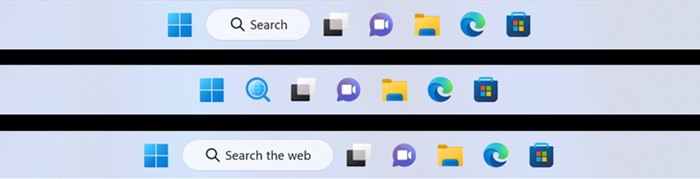 当前 Windows 11 在任务栏上附带了一个可被禁用的搜索按钮(仅显示搜索徽标),但微软现正测试三种不同样式的任务栏 UI 。