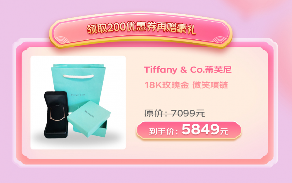 要说最适合七夕情人节送给爱人的礼物,首饰类绝对不会出错。比如这款非常受女生欢迎的蒂芙尼 (Tiffany & Co.)微笑项链。18K玫瑰金的材质,简约的设计,百搭又高级。在京东国际买手店会场,除每满1000减80的福利外,还可领取满999减100、满6000减590等优惠券叠加使用,原价7099元,多重福利满减后到手价仅需5849元。