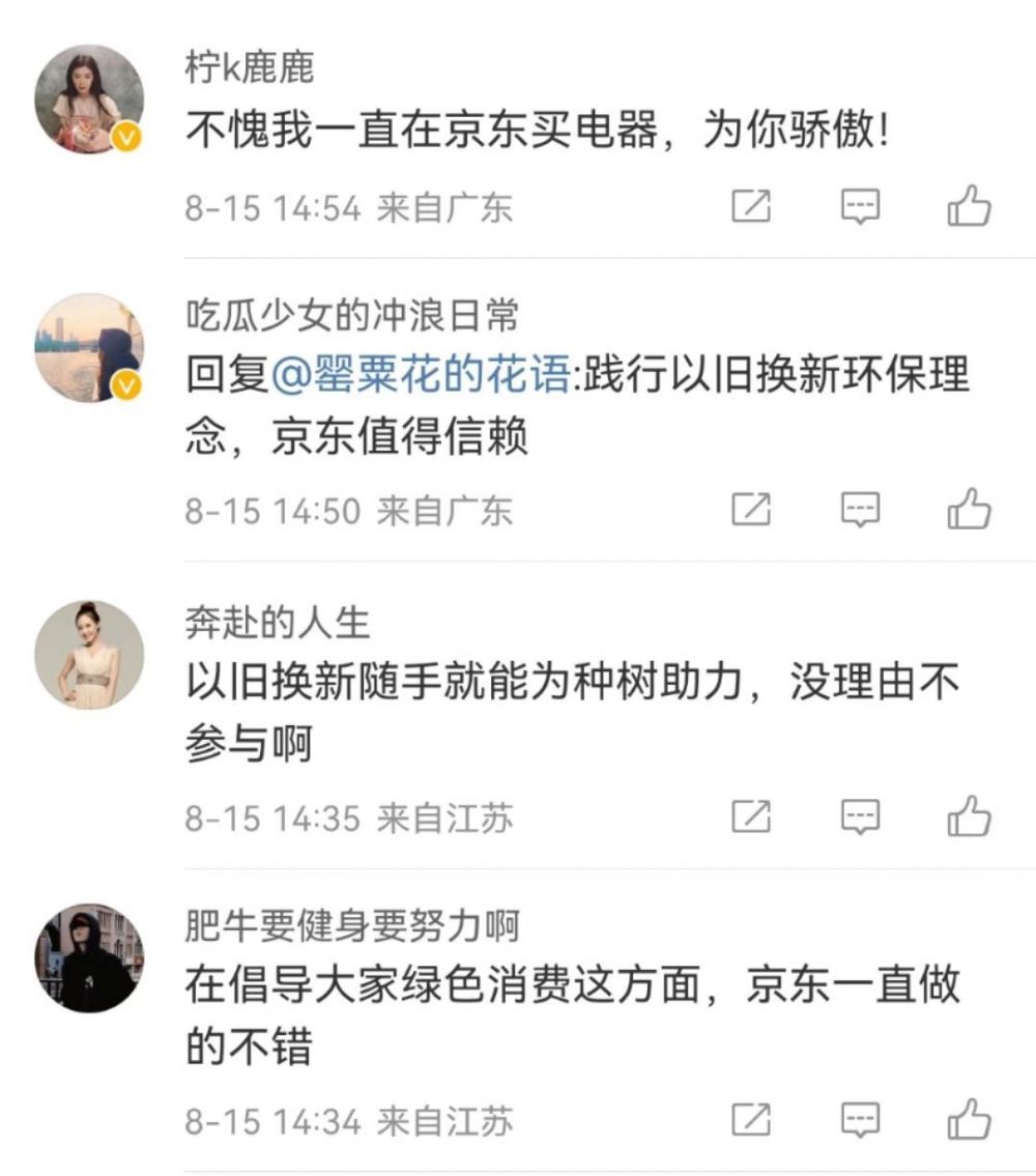 在更多年轻消费者开始选择通过以旧换新践行绿色消费的同时,京东也始终致力于推动绿色低碳消费。近日,京东宣布联合中国绿化基金会开展“以旧换新1元绿色行动”公益项目,消费者在京东每完成1笔电器产品以旧换新订单,京东都将捐赠1块钱用于公益植树,携手广大消费者及合作伙伴,以公益捐赠的形式让环保行动落到实处,引发消费者围观。