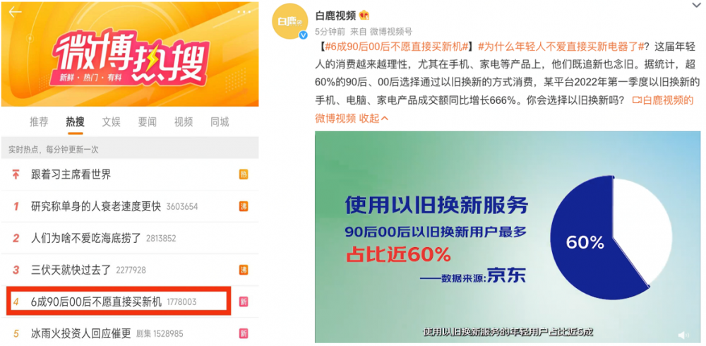 如今,90后、00后成为主力消费群体,精打细算的他们在追求品质生活的同时,也关注低碳环保与绿色消费。根据京东数据显示,近60%的90后00后消费者选择通过以旧换新的方式购买电器产品,“6成90后00后不愿直接买新机”的话题近日在微博热搜引发关注与热议,年轻人的消费理念再次成为焦点。