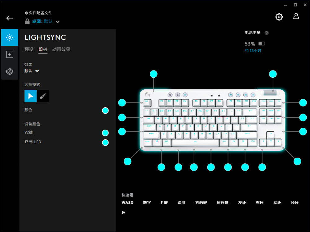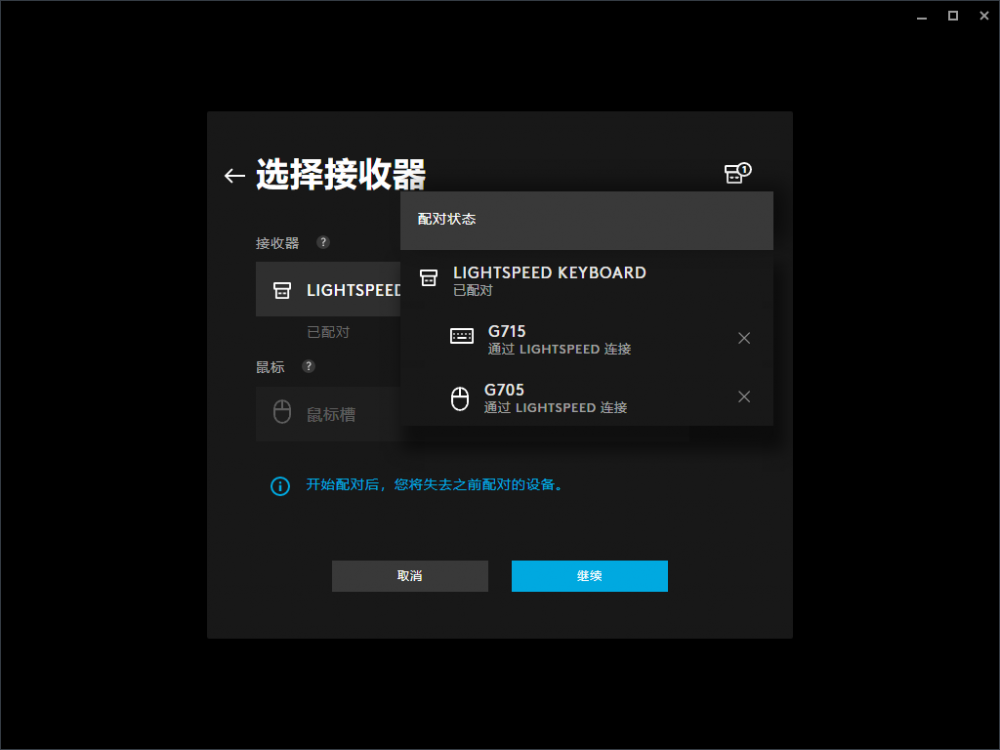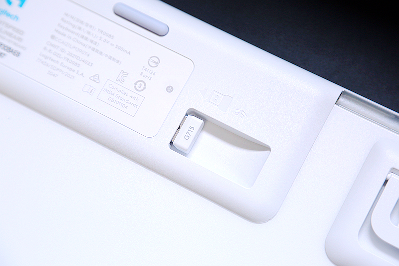 除此之外,在连接性上,与鼠标一样支持LIGHTSPEED无线和蓝牙,同时同样的USB-C接口同步支持充电、有线连接和固件升级。但是不一样是,G715附带了连接适配器的收纳槽,对于防止丢失能够起到很大的作用。当然,有必要提及的是,G715和G705作为套装出现的时候,鼠标收纳的作用会被削弱,原因是鼠标和键盘可以支持单个适配器公用单个适配器,只需要在设置界面下进行单适配器的增加绑定即可。