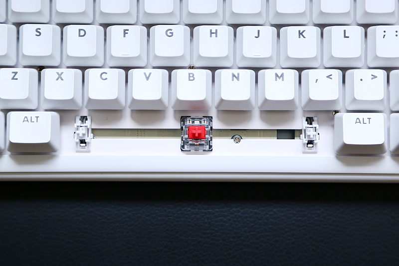 而键盘的机械轴目前提供红、茶两种轴体可选,我们手上这台则是更适用于游戏场景的红轴,产品来自凯华旗下的龙华系列,自带LED。在输入感受上,其属于典型的无段落直上直下键入,但是相比我们之前用过的红轴,其触发克数似乎要略大,并且键轴偏紧实,没有任何晃动感。而诸如空格之类的大键也采用了卫星轴设计,很好的杜绝了弹簧音等问题,整体的键入噪音也极小,比较适合手劲还算大的妹子。当然,如果你平时打字较多,游戏只是日常使用的一部分,为了避免输入疲劳感,那么我们更建议选择茶轴。