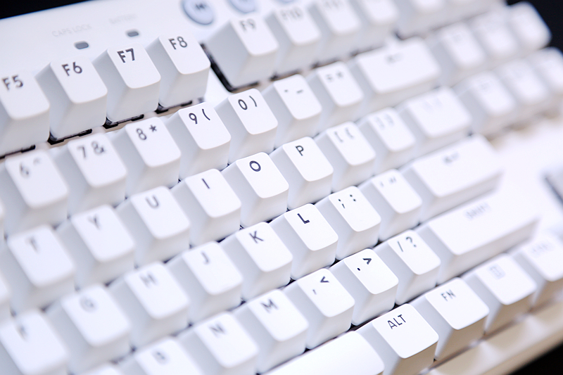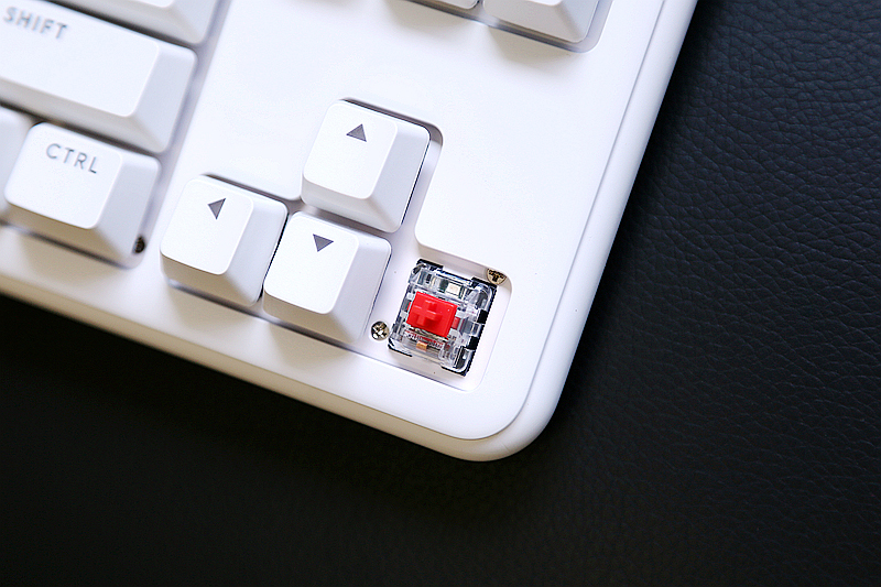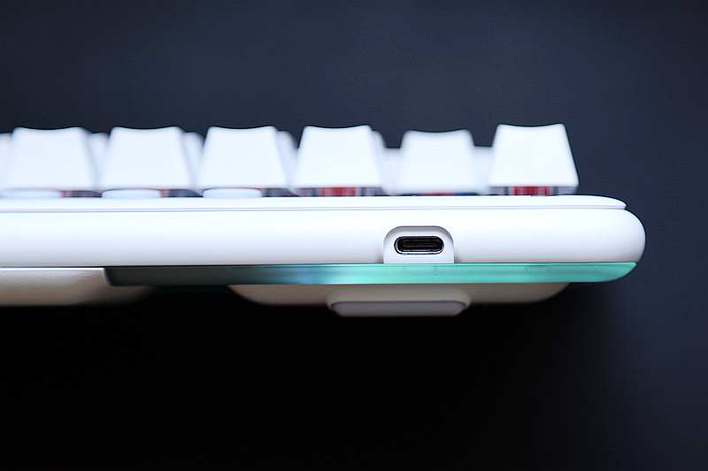 这款键盘的键帽采用了PBT材质双色注塑透光设计,可以很好的防止长期使用导致部分键帽表面打油泛光的问题。整个按键采用非嵌入全高键,属于典型的复古健体,在输入的时候相比埃轴或者嵌入键更符合人体工学。