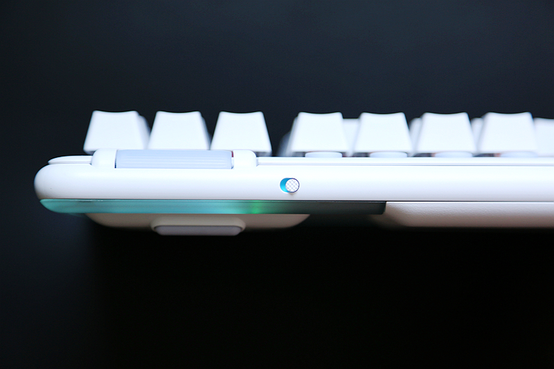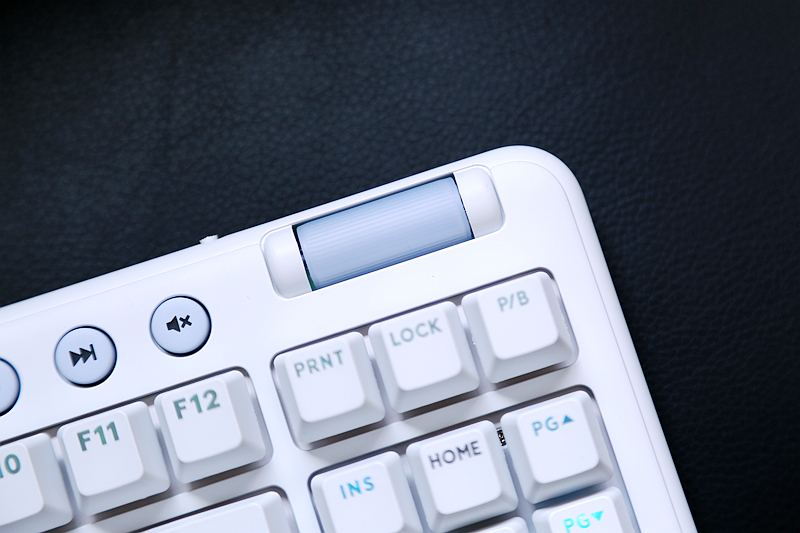 这款产品的按键分布方式没有采用办公化的超窄边设计,而是将一定的空间留给了多媒体快捷键,目的就是解决一些娱乐场景下能够一键便捷的功能。而且产品移植了大G具有代表性的音量调整滚轮,滚轮依旧是那种低阻尼的无级操控,当然方便性还是不言而喻的。