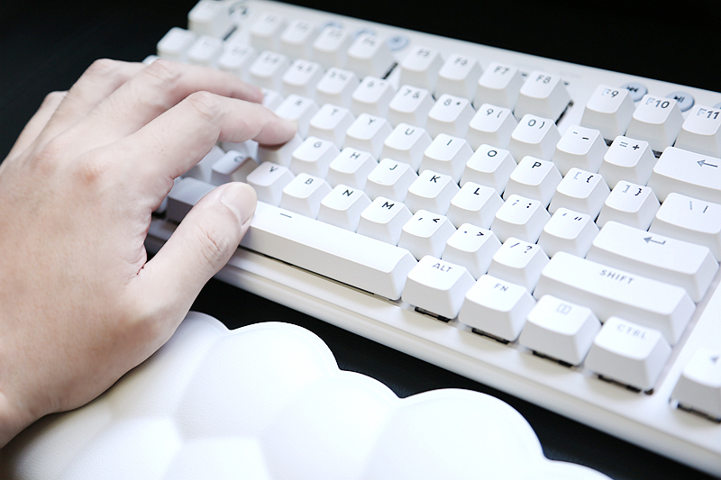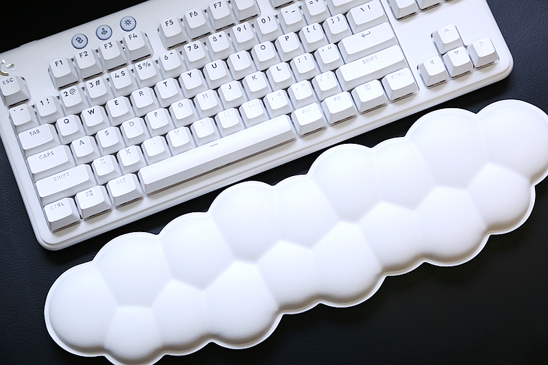 值得一提的是,G715还附带了一个专属云朵造型的手托垫,其内充海绵,表面皮革材质加工,触感柔软,相比起塑料一体化手托显然更加舒适,并且分离使用也更为自由,在长时间键入时能够在很大程度上缓解腕部疲劳感。