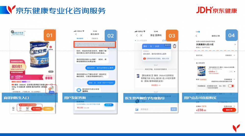 以特医食品为例,据统计超过90%的肿瘤患者没有接受过规范的营养教育,营养知识获取途径不足。针对这一消费痛点,除了严格把控产品质量,京东健康也积极发挥医疗健康服务能力,引入专业化的咨询服务,通过营养师、医生的全面指导,为用户提供商品购买与使用建议。