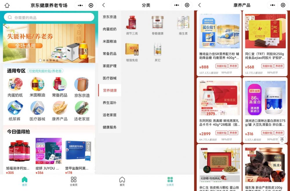 比如,依托京东健康的O2O服务模式,可以有效解决老年人购买营养保健品不便的问题。面向失能、残疾等老年群体,京东健康通过与地方政府合作,打造专属专项的服务体系,满足老年人群的健康需求:从2021年开始,在与北京市政府合作的“北京通养老助残卡”项目中,京东健康便开辟了京东健康北京通养老助残卡专区,满足失能及高龄老人居家养老的健康需求,成为切实推动“互联网+营养保健”的有效实践。