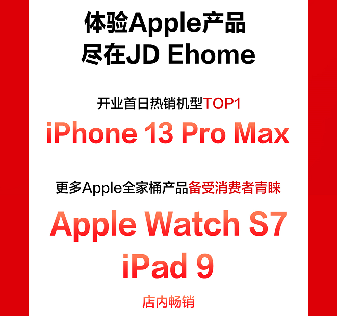 根据开业首日的数据,iPhone 13 Pro Max 256G成为门店热销机型TOP 1,Apple Watch S7、iPad 9等Apple全家桶产品也备受到店消费者青睐。除了走进JD Ehome门店体验Apple产品,消费者还能在店内享受线上线下相同的品质服务,包括Apple新品优先购买、数据迁移、贴膜等服务,购机更省心、更便捷。