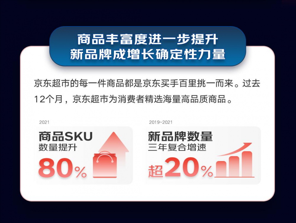 过去12个月,京东超市为消费者精选海量高品质商品,商品SKU数量提升80%,新品牌的数量三年复合增速超20%。