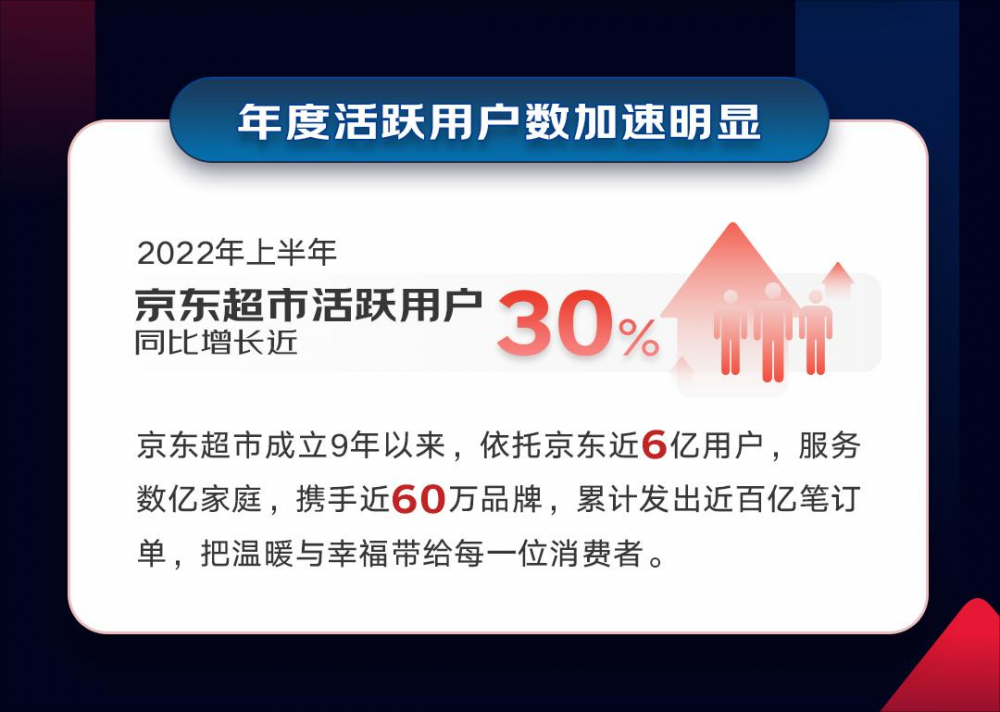 2022年上半年,京东超市活跃用户同比增长近30%。京东超市成立9年以来,依托京东近6亿用户,服务数亿家庭,携手近60万品牌,累计发出近百亿笔订单,把温暖与幸福带给每一位消费者。