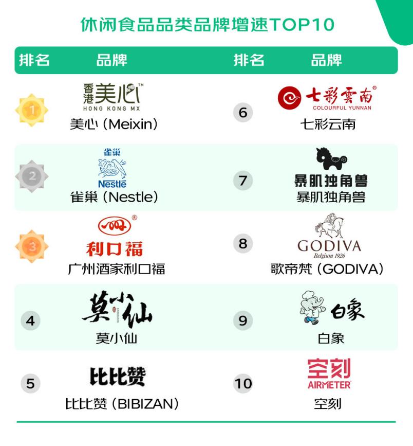 近年来,更加多样化、能为日常生活带来更多快乐的休闲食品持续受欢迎。基于全球绝佳口味,品质、健康饮食等特质,京东超市成为消费者信赖的商超购物首选。此次上榜京东超市百强的品牌中,美心(Meixin)、雀巢(Nestle)、广州酒家利口福、莫小仙、比比赞(BIBIZAN)、七彩云南、暴肌独角兽、歌蒂梵(GODIVA)、白象、空刻成为休闲食品品类品牌增速TOP 10,休闲零食单品纷纷发力、集体放价,为消费者带来假日“好食光”。