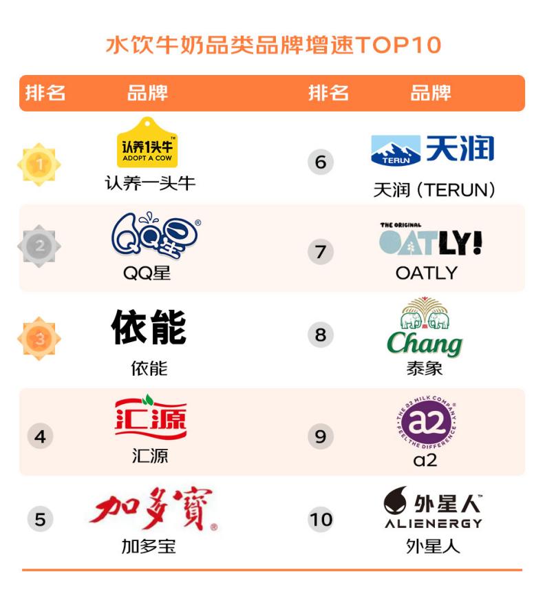 “低糖、零卡”类新兴水饮深受年轻人喜爱,夏秋之交,水饮、牛奶等细分品类,同样解锁出了很多新消费趋势。在京东超市“2022快消、生鲜品牌增速100强”榜单中的水饮牛奶细分榜单,同样给出了消费参考,凭借为消费者带来健康、营养、丰富口感等产品体验,认养一头牛、QQ星、依能、汇源、加多宝、天润(TERUN)、OATLY、泰象、a2、外星人成功位列水饮牛奶品类品牌增速TOP 10榜单。