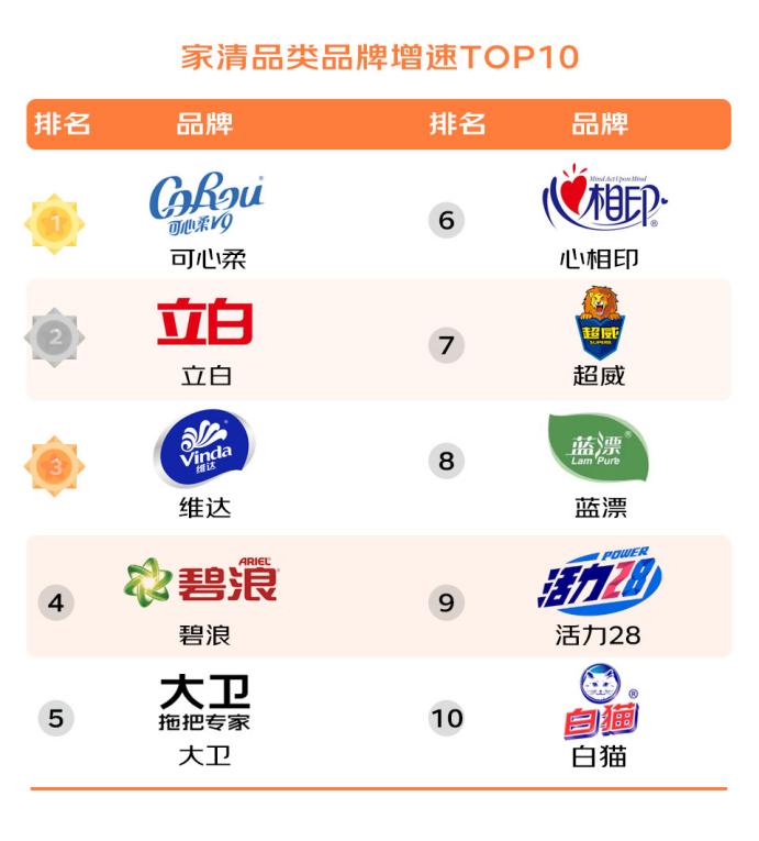 在追求卫生洁净、便捷高效体验的背景下,家庭清洁用品围绕细分人群、细分场景不断推陈出新,京东超市以用户需求为导向,为消费者带来更多便捷环保的家清好物。作为家清品类品牌增速TOP 10,洁柔、立白、得宝、碧浪、大卫、全棉时代、超威、蓝漂、活力28、白猫携手京东超市,延伸出“圈层专属”和“一专多强”等趋势品,让生活洁净清爽的同时,带来独一无二的呵护感。