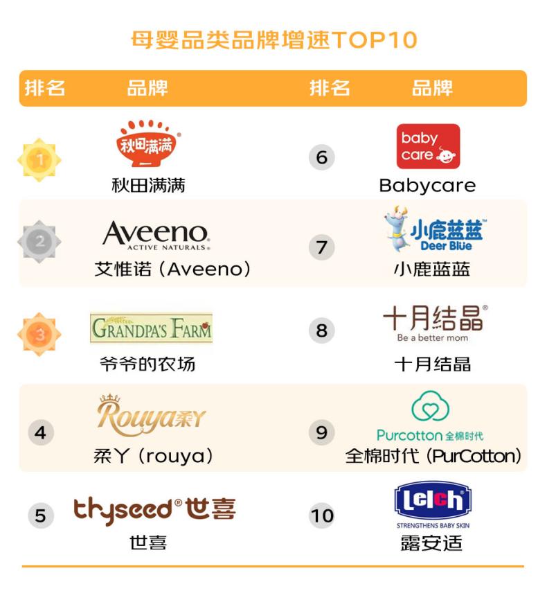 消费观念、育儿理念的改变,让消费者在选购母婴产品时更偏好高端化、精细化产品。面对当下母婴消费趋势,京东超市“2022快消、生鲜品牌增速100强”榜单中的母婴细分榜单,将为新生代年轻爸妈提供科学育儿消费指南。秋田满满、艾惟诺(Aveeno)、爷爷的农场、柔丫(rouya)、世喜、babycare、小鹿蓝蓝、十月结晶、全棉时代(PurCotton)、露安适等十大品牌纷纷登榜,为母婴消费者带来值得信赖的品质好物。