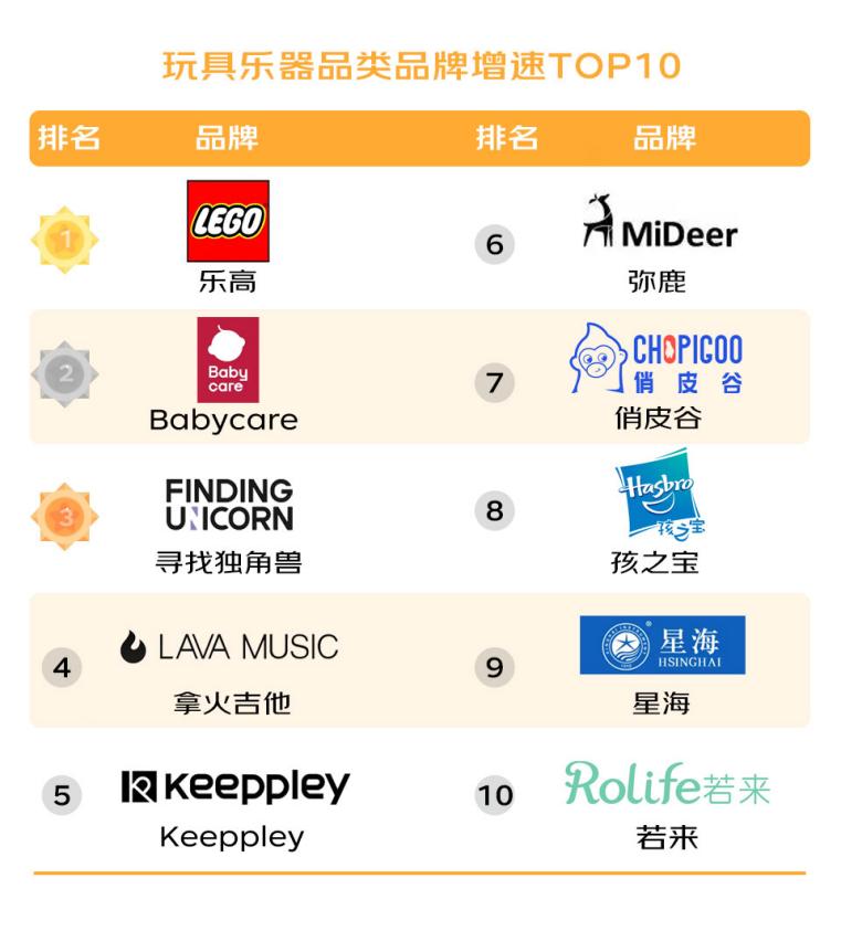 如今,玩具的受众群体更为广泛,具有艺术性、潮流性的潮玩,寓教于乐的STEAM玩具,响应素质教育的钢琴、吉他等乐器,受到消费者青睐。汇聚优质IP、益智启蒙玩具乐器的京东超市,为成人和孩子放松身心送去欢乐。在此次发布的榜单中,乐高、Babycare、寻找独角兽、拿火吉他、Keeppley、弥鹿、俏皮谷、孩之宝、星海、若来位居玩具乐器品类品牌增速TOP 10,全面满足安全玩耍、早教启蒙、送礼等场景需求。