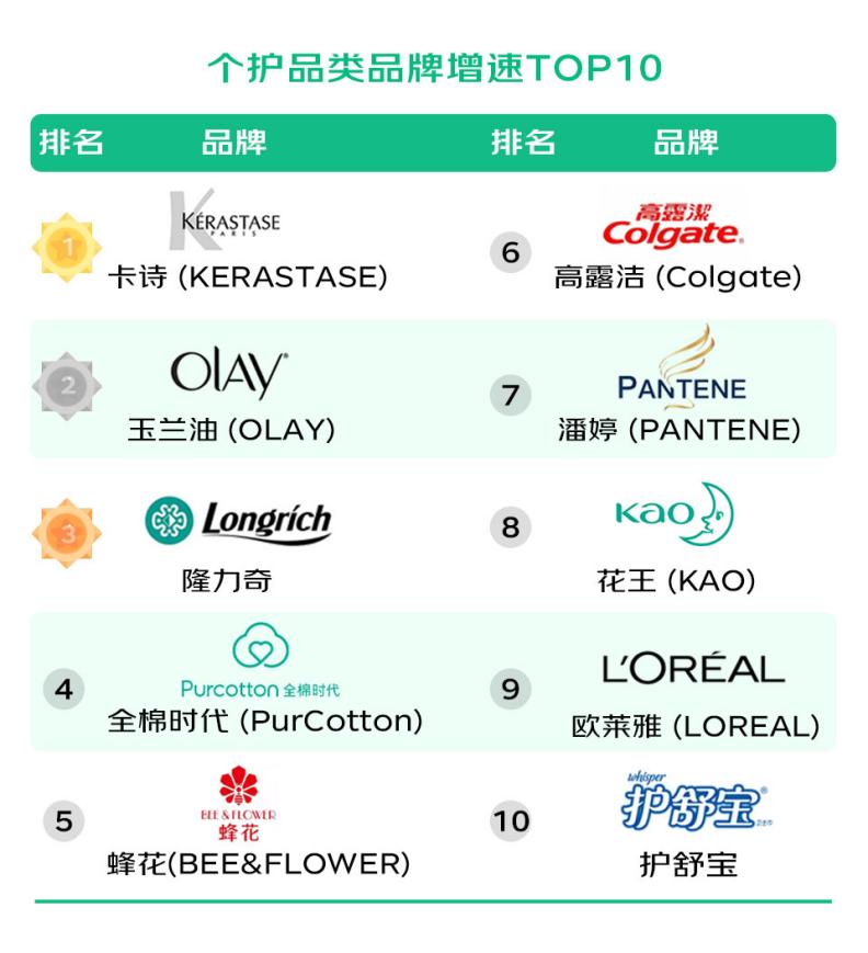随着生活品质的提高,消费者对个护产品的亲肤性、舒适度有了更高诉求,对护肤、护发、护齿用品的成分、质地和触感也有了更多精细化需要。在京东超市个护品类品牌增速TOP 10中,卡诗(KERASTASE)、玉兰油(OLAY)、隆力奇、全棉时代(PurCotton)、蜂花(BEE&FLOWER)、高露洁(Colgate)、潘婷(PANTENE)、花王(KAO)、欧莱雅(LOREAL)、护舒宝等品牌,全方位满足消费者“呵护自己”的品质生活需要,成为规模与增速双强。