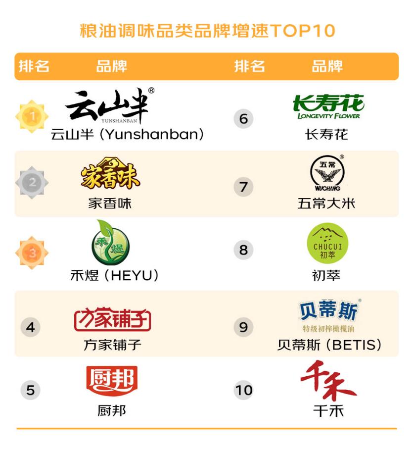 粮油调味是家家户户必备的生活必需品,为满足不同消费者的购物需求,京东超市洞察新消费趋势,持续推新维新,使粮油调味这一传统细分赛道呈现出新意。从上榜品牌来看,位居粮油调味品类品牌增速TOP 10,分别为云山半(Yunshanban)、家香味、禾煜(HEYU)、方家铺子、厨邦、长寿花、五常大米、初萃、贝蒂斯(BETIS)、千禾,新锐品牌汇聚的粮油调味矩阵,为消费者送上“舌尖上的新鲜”。