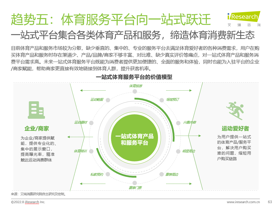 另外,一站式平台集合各类体育产品和服务,将缔造体育消费新生态。透过白皮书调研不难发现,目前的体育产品和服务市场仍存在一些问题,主要是缺乏垂直的、集中的、专业的服务平台去满足体育爱好者的各种消费需求,用户在购买体育产品和服务时存在渠道少、产品/品牌/商家不够丰富、对比难、缺少真实评价等痛点,对一站式体育产品和服务消费平台需求高。找到痛点等于是找到发展方向,相信未来一站式体育服务平台一定既能为消费者提供更加便捷的、全面的服务和体验,同时也能为入驻平台的企业/商家赋能,帮助商家更直接有效地链接到体育人群,提升获客机率。