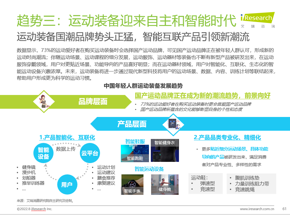 此外,运动装备也将迎来自主和智能时代,其中国产运动品牌势头正猛,智能互联产品将引领新潮流。数据显示,73%的运动爱好者在购买运动装备时会选择国产运动品牌,可见国产运动品牌正在被年轻人群认可,形成新的运动时尚潮流。伴随运动场景、运动课程的细分发展,运动服饰、运动器材等装备也不断有新型产品被研发出来,在运动服饰穿戴领域,用户对更贴近场景、功能导向的产品喜好明显;而在运动器材领域,用户对智能化、互联化、生态化的智能运动设备兴趣浓厚。未来,运动装备将进一步通过现代新型科技将用户的运动场景、数据、内容、训练计划等联结起来,帮助用户形成更为科学的运动习惯。