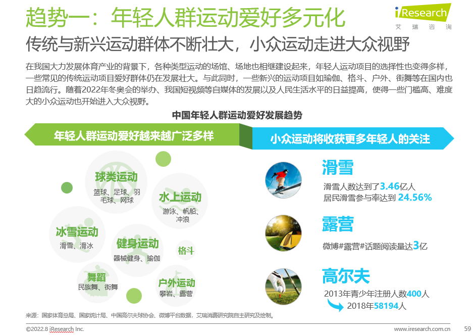 白皮书数据显示,年轻人群运动爱好呈现多远化发展。伴随着各种类型运动的场馆、场地相继建设起来,年轻人运动项目的选择性也变得多样,常见的传统运动项目爱好群体仍在发展壮大。与此同时,一些新兴的运动项目在国内也日趋流行,滑雪、露营、高尔夫等一系列小众运动项目也获得更多年轻人的关注。