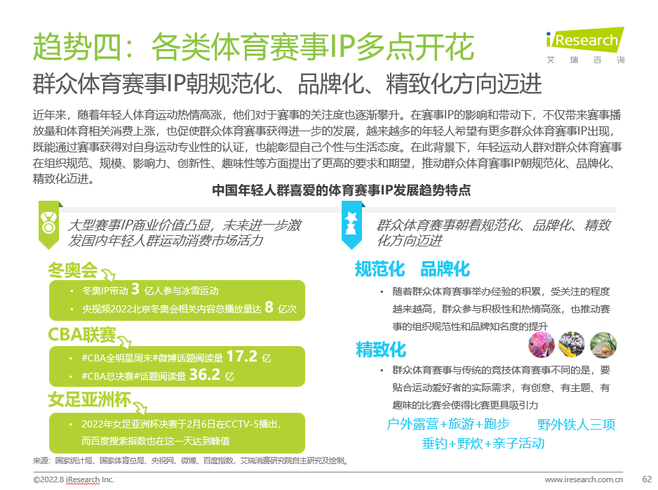 而当代年轻人对群众体育赛事有似乎着较高的参与热情,并推动群众体育赛事不断朝着规范化、品牌化、精致化方向迈进。在赛事IP的影响和带动下,不仅带来了赛事播放量和体育相关消费上涨,也促使群众体育赛事获得进一步的发展,越来越多的年轻人希望有更多群众体育赛事IP出现,既能通过赛事获得对自身运动专业性的认证,也能彰显自己个性与生活态度。
