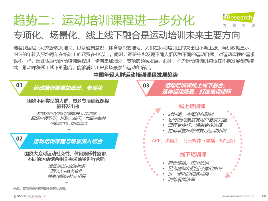 随着年轻人群运动类目及需求的多元化,运动培训也将进一步分化,专项化、场景化、线上线下融合将成为运动培训未来的主要方向。调研中发现不同人群因为不同的运动目标,对运动课程的需求也不一样,进而驱动运动培训课程进一步向细分、专项的领域发展。此外,不少运动培训机构也在不断发展创新模式,推动课程线上线下的融合,满足用户多场景参与运动和培训。