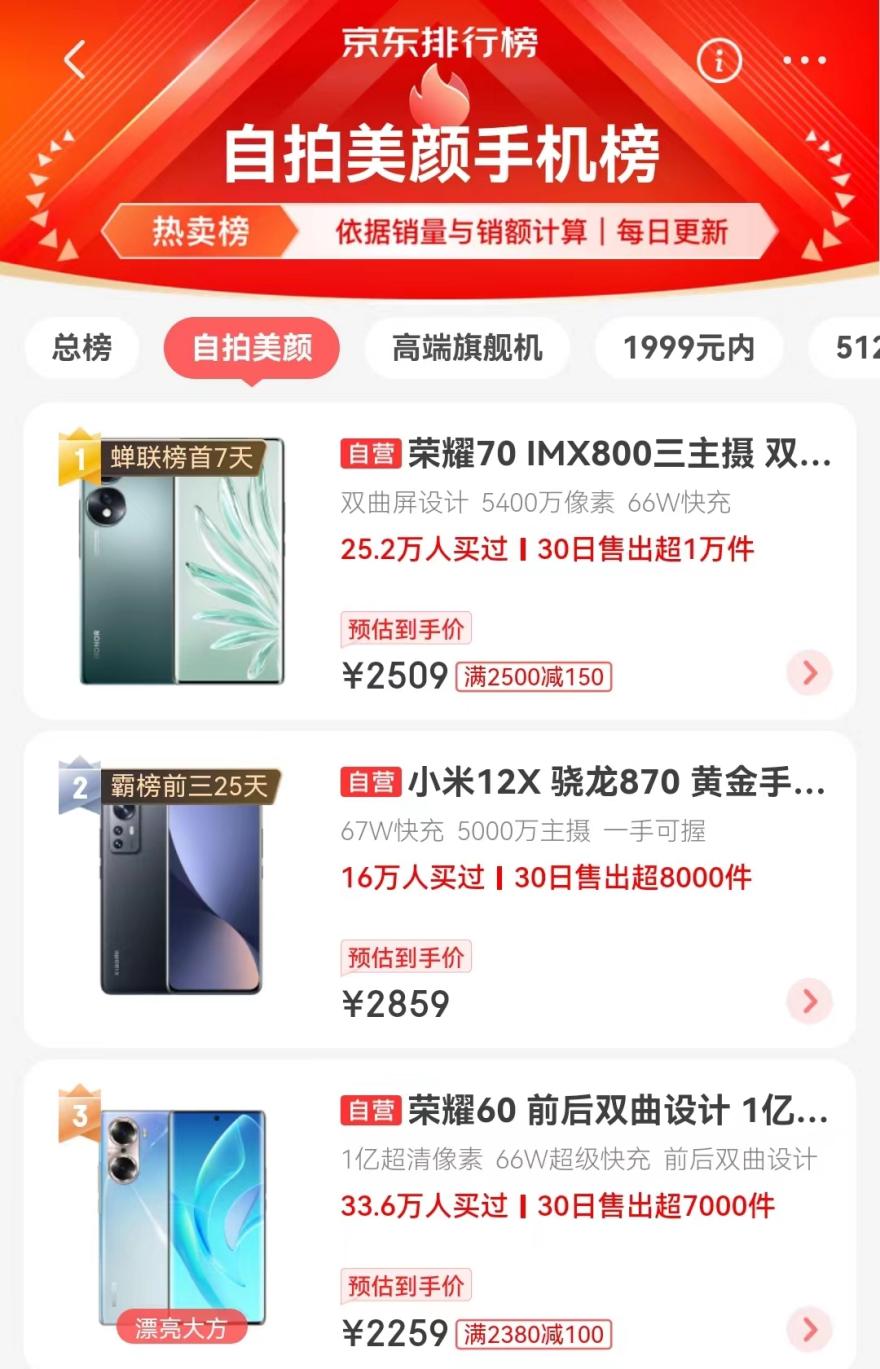 秋天风景怡人,拍摄美景的同时来一张自拍,记录美好时光,推荐入手荣耀70,该机型连续7天蝉联京东排行榜自拍美颜手机榜No.1。借助荣耀RAW域算法体系、HONOR Image Engine计算影像平台,荣耀70从底层重构影像能力,画质得到大幅提升。荣耀70的Vlog主角模式下,可在拍摄中自动追焦人像,同时输出两路视频画面,秋日出游Vlog轻松搞定。此外,荣耀70深度优化前置镜头,自拍人像更真实。荣耀70京东到手价2509元起,可享12期免息、以旧换新补贴450元的优惠福利。