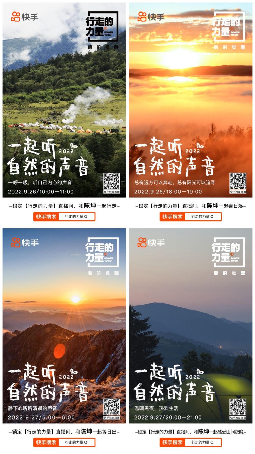 在“行走的力量”过往的路线中,有苍茫的雪山、深邃的峡谷、静寂的森林、绵延的草甸,行者们可以近距离欣赏流云、飞鸟、日月星辰以及篝火飞溅。这样的独特体验令人向往,但项目每年只能带有限的人一起行走,甚至出现过100多万人报名选20人的情况。为了让更多人参与其中,快手与“行走的力量”携手准备了4场环境直播,分别在9月26日的10:00-11:00、18:00-19:00,9月27日的5:00-6:00、20:00-21:00,邀请用户线上感受行走,一起聆听自然的声音。