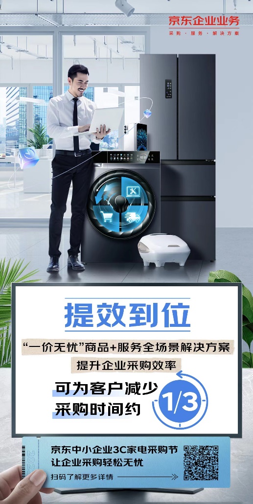 由于自身规模、技术、资金等方面的限制,采购时间周期长、采购流程繁琐复杂等所造成的采购效率低问题也一直困扰着中小企业。在京东中小企业3C家电采购节期间,京东还为企业级客户提供了“一价无忧”商品+服务全场景解决方案,为企业客户打造了全流程、一站式的采购体验,让企业客户无需二次申请采购费用,即拥有包勘测、包设计、包安装、包辅材的采购权益,工程交付体验省心、省时、省力、高效便捷。京东数据显示,该解决方案可为客户减少约1/3的采购时间,大幅提升企业采购效率,助企业实现提效到位。