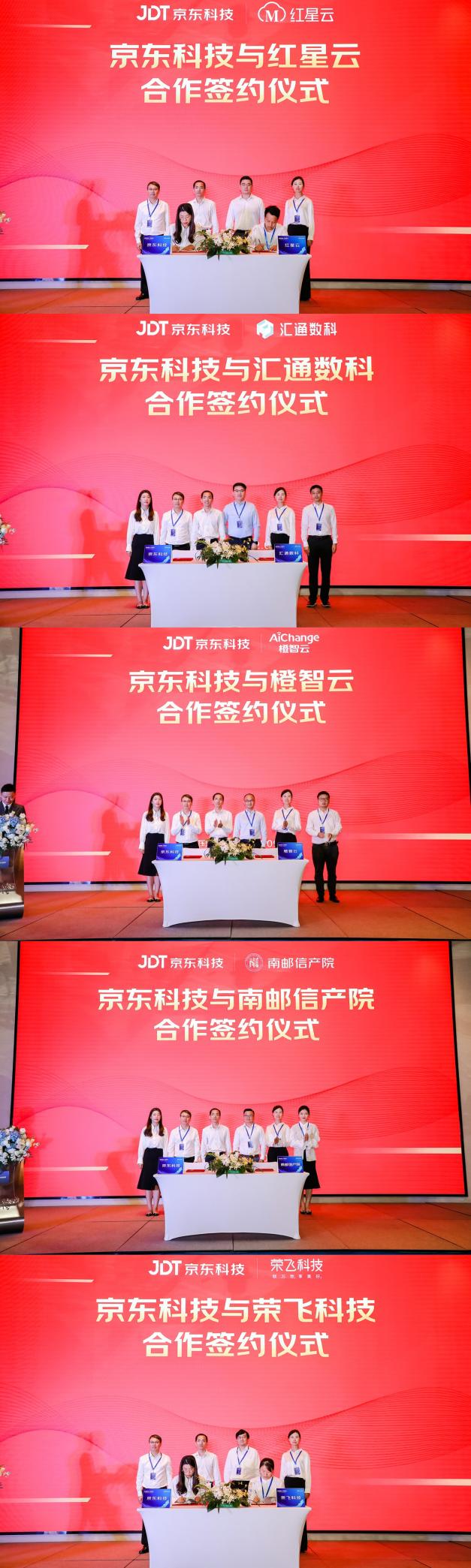 会上,京东科技正式与上海红星云计算科技有限公司、汇通数科智能科技有限公司、江苏橙智云信息技术有限公司、南邮信息产业技术研究院以及南京荣飞科技股份有限公司签署合作伙伴协议,并计划在智慧城市、数字产业、数字乡村、智慧园区等多个领域展开合作,实现资源共享、优势互补。