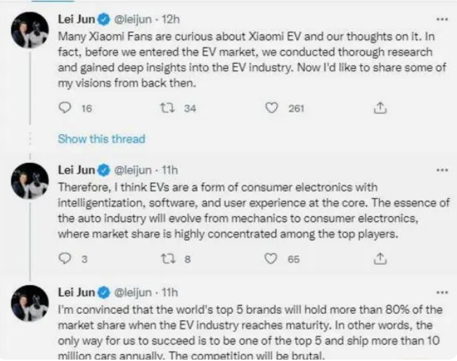 并谈及行业变化,雷军还表示,认为电动汽车是一种以智能化、软件化、用户体验为核心的消费电子产品。汽车行业的本质将从机械行业演变为消费电子行业,市场份额将高度集中在顶级厂商手中。