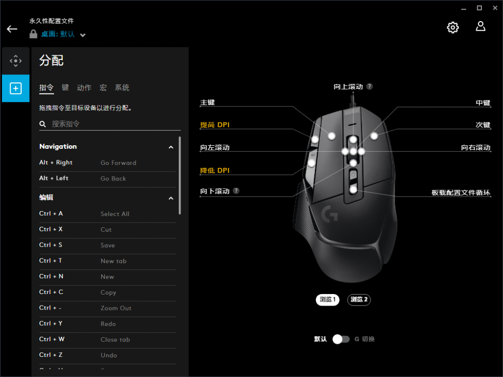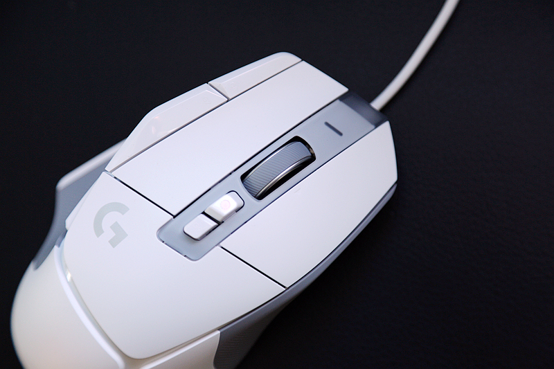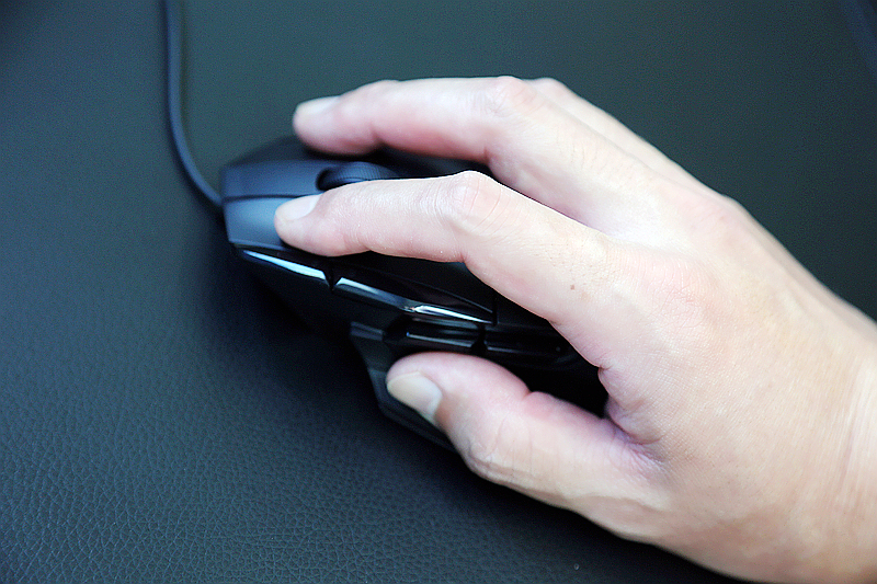 说到按键,这块产品采用13键设计,其中支持自定义的按键达到了11个,除了左右主键外,滚轮支持四向操作,并且通过下方挡位键支持两档滚动模式切换,正面还附带了板载配置切换按键和DPI高低两项调节快捷键,而侧面拇指区附带前进、后退按键和DPI切换键。配合Logitech G HUB的应用程序,玩家可以自定义按键的功能和宏指令的编辑与调用,在复杂的游戏动作和游戏场景切换中能够发挥快捷调整和功能释放的作用。