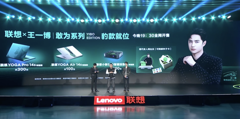 活动当晚发布了三款联想×王一博“敢为系列”特别款产品,分别是:联想YOGA Pro 14s王一博特别款、联想YOGAAir14s王一博特别款和联想小新520智能投影仪王一博特别款。三款产品均采用了“黑豹”这一设计元素,作为王一博标志性元素之一,寓意“突破极限、超越自我”。同时借助创新科技将艺术、科技与环保进行了巧妙融合,向外界传达出联想作为科技企业的科技创新底蕴与社会责任。