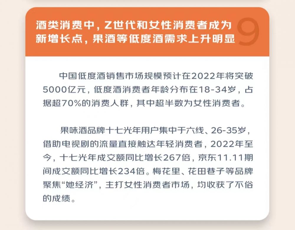 在酒类消费中,中国低度酒销售市场规模整体保持高速增长态势。果味酒品牌十七光年用户集中于六线城市、26-35岁人群,借助电视剧的流量直接触达年轻消费者,在京东超市11.11预售中,十七光年果酒成交额同比增长 123%。