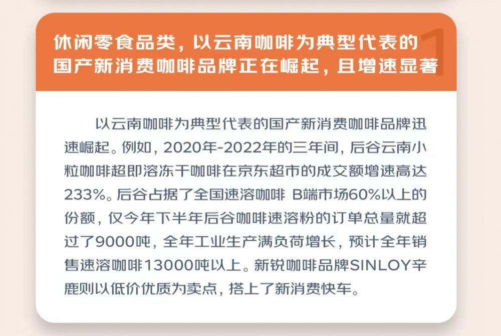 在休闲零食品类,以云南咖啡为典型代表的国产新消费咖啡品牌正在崛起,在2020-2022三年间,京东云南咖啡销量增长6倍,用户数量增长五倍。新锐咖啡品牌SINLOY辛鹿则以低价优质为卖点,将“口粮咖啡”标签植入消费者的心中,搭上了新消费快车。