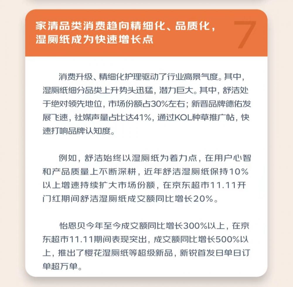 在家清品类中,消费升级、精细化护理驱动了行业高景气度,其中湿厕纸细分品类上升势头迅猛,潜力巨大。比如德佑主打高性价比与柔软,舒洁主打可溶、速干等特性与洁肤功效,都获得了销售增长。